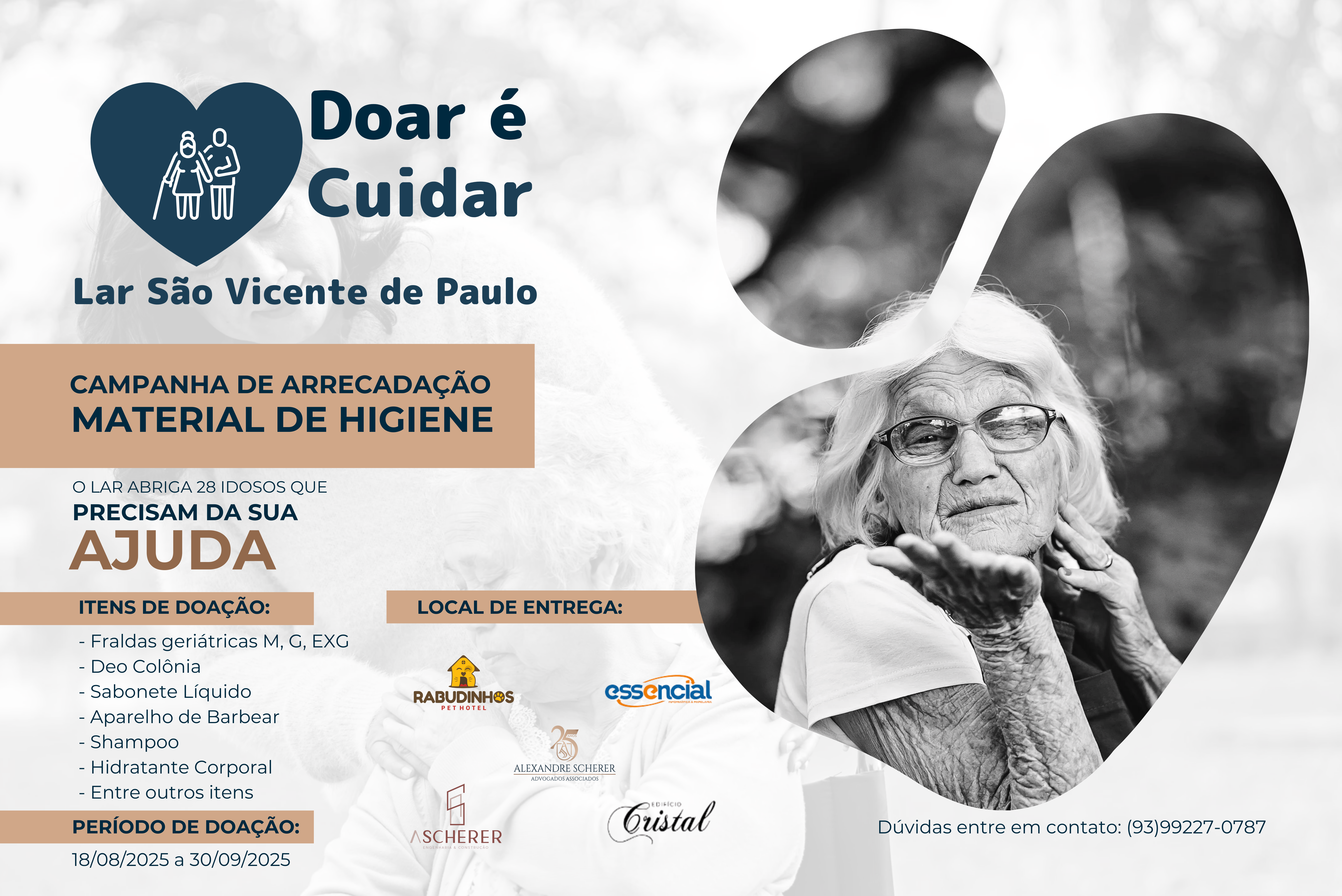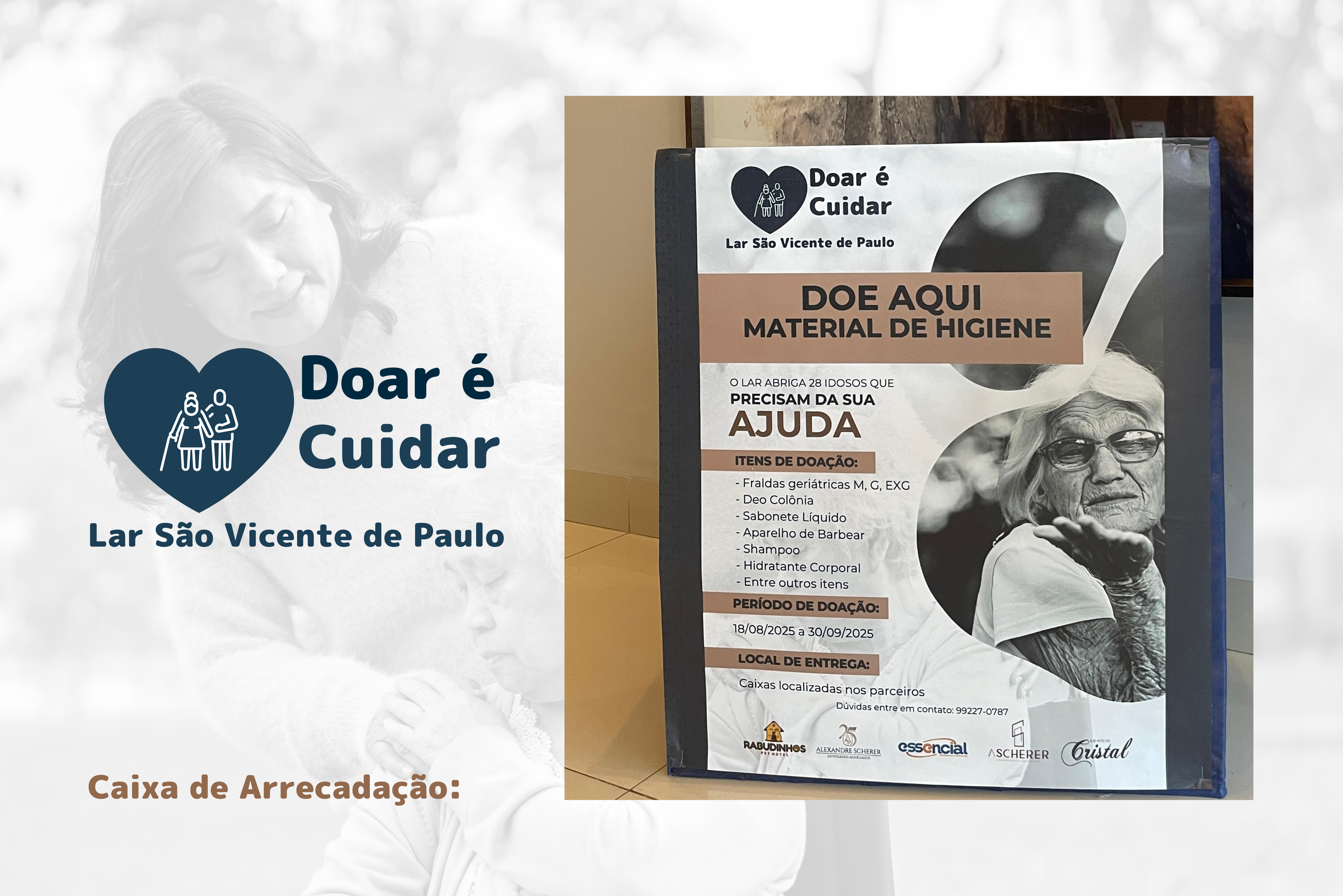 No período de 18/08/2025 à 30/09/2025 estamos realizando a Campanha DOAR É CUIDAR, com o objetivo de arrecadar produtos de higiene pessoal para os idosos do Lar São Vicente de Paulo.